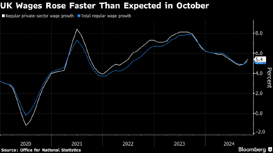 英国国家统计局周二表示,在截至10月底的三个月,不包括奖金的薪资增长加速至5.2%,受私营部门工资激增助推。这是自2023年8月以来首次加速增长,高于经济学家预期的5%。